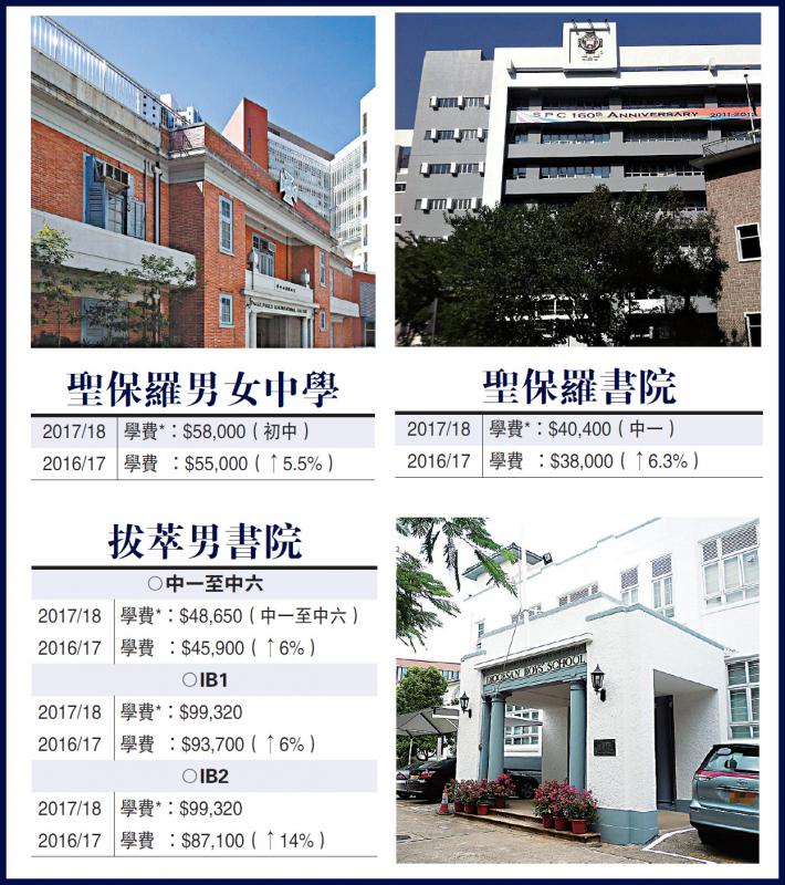 直資學校學費愈來愈貴。全港近六成直資學校擬於新學年調高學費,加幅介乎5%至20%,包括聖保羅男女中學、聖保羅書院及拔萃男書院等多間傳統名校。其中,拔萃男書院更是連續四年申請加費,本地課程擬加至48650元,加幅為6%。直資學校年年加費,令家長憂慮直資「貴族化」,嚇窒中產爸媽,有家長代表建議教育局加強監管審批學費機制。/大公報記者 劉家莉