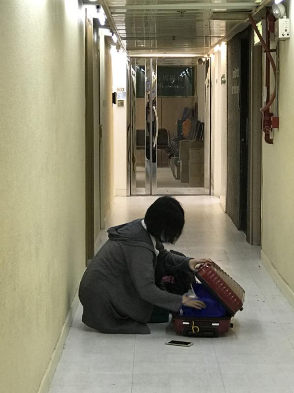 圖:一名購入PD-1的女士於邵祖德診所外,把藍色冰袋連針藥放入行李