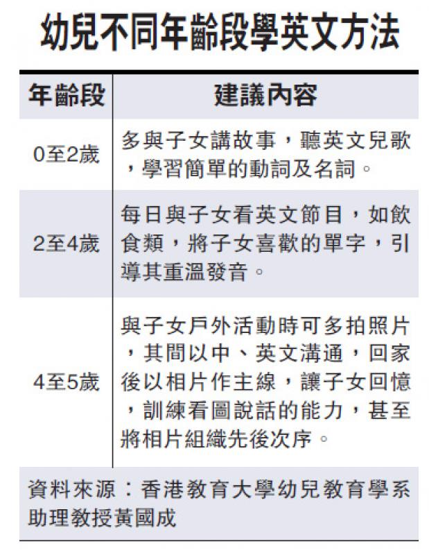 黃國成引述美國研究稱,幼童每日需三小時接觸一種語言,他認為就算做不到三小時,至少要有半小時,家長可配合幼兒的作息時間,建議在早餐時段,用中、英文與子女交流,既加強親子關係,又可訓練英語。幼兒階段最重要是培養他們不抗拒、並喜歡學習英語,「不是要學得有多好,而是不怕接觸」。黃國成表示,父母教英文最關鍵兩個元素,即微笑和動作,讓幼兒對英語產生好感,並與之互動。