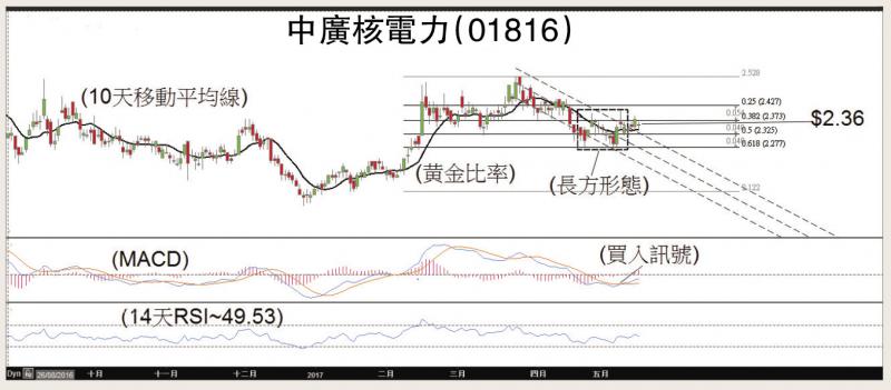 從2.53元的近期股價高位下滑至黃金比率0.618後,形成長方形態的中廣核股票,開始站穩!領先指標14天相對強弱指數(RSI)49.53未到超買,及指數平滑異同移動平均線(MACD)也顯示了買入訊號。