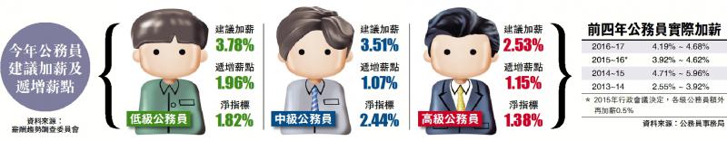 根據過往資料,今次加薪幅度創2010年以來新低,從2011年起,除2013及2015年外,全體公務員加薪幅度最少有4%(詳見表)。今次加薪淨指標偏低,除了因去年經濟情況不景氣,另一主因是須扣減的遞增薪點創新高,其中,低級公務員須扣減的遞增薪點為1.96%,以致加薪總指標雖然是三級公務員中最高,但經過扣減薪點後,較中級公務員淨指標為低。