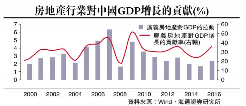 房地產膨脹更為嚴重。因為發展階段和統計口徑差異,中國房地產增加值佔GDP的直接比重並不高,僅為7%,而美、日佔比都在10%以上。但2008年以來,中國房地產增加值佔GDP比重累計上升了兩個百分點,相比之下其他國家反而穩中有降。如果考慮到間接效應,房地產對經濟影響要大得多。根據我們的測算,中國三分之一的經濟與房地產有關。2016年6.7%的GDP增長中有2.4個百分點是由廣義房地產行業拉動起來的,對GDP增長貢獻率高達36%,而2015年貢獻率僅為25%。