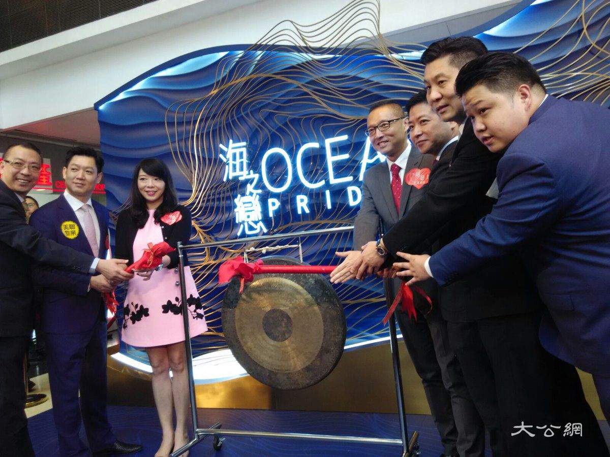 海之戀「揸盤人」郭子威(中)率代理為海之戀敲響鑼鼓,寓意該盤正式開鑼(大公報記者梁穎賢攝)