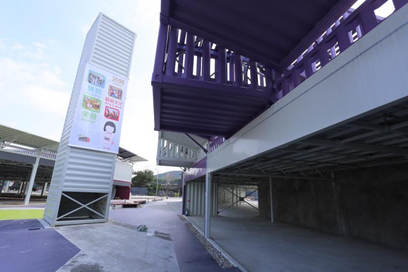 購物城以紅色、紫色及白色的仿貨櫃箱組合而成,佔地42萬平方呎,屬單層建築
