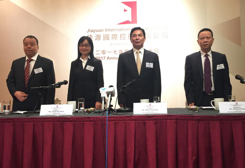 圖:左起:佳源國際執行董事王建鋒、行政總裁卓曉楠、主席沈天晴、副主席黃福清 大公報記者吳涵宇攝