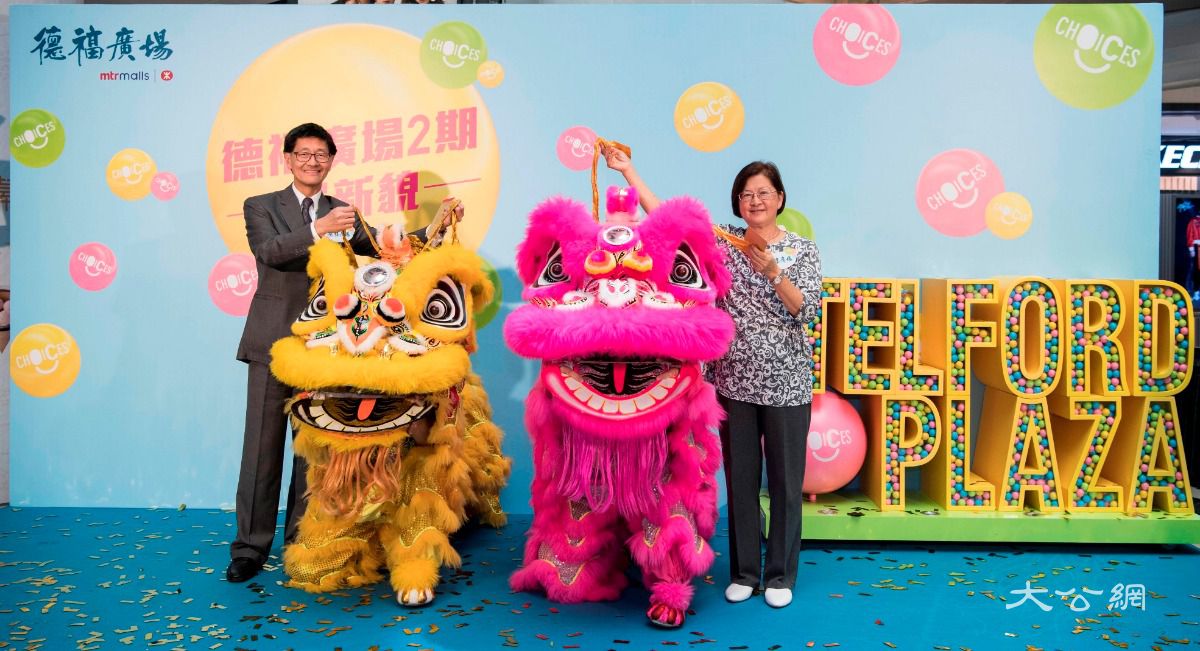 港鐵公司行政總裁梁國權及德福花園業主委員會主席潘任惠珍為醒獅掛紅。