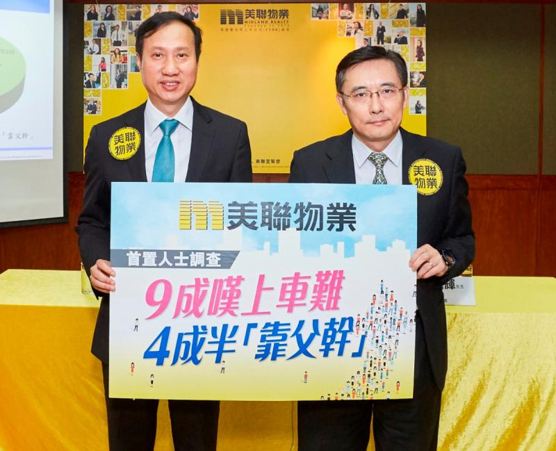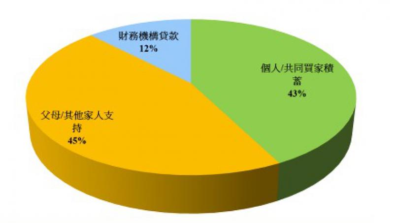 調查中有28%受訪者未持有物業但計劃置業。當中有9成首置人士認為目前上車困難,當中有45%受訪者考慮靠父母或其他家人協力支付首期,43%受訪者會使用個人或買家積蓄,從以上數據得知,買樓「靠父幹」已成首置人士的主流。