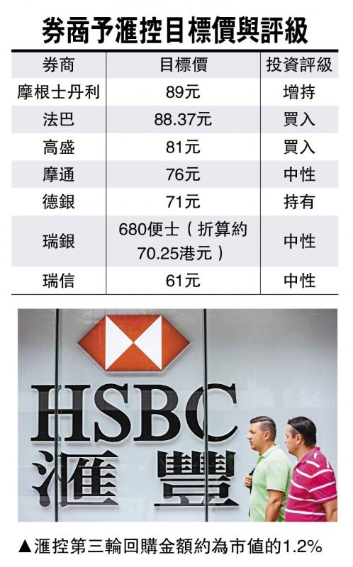 根據瑞銀估計,第三輪迴購金額約為滙控市值的1.2%,又指滙豐短期內仍有能力回購額外20億美元股份。
