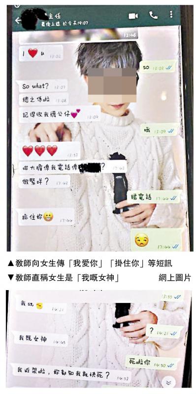 facebook專頁「盡在元朗」前日有網民上載其妹妹與老師的WhatsApp對話。該網民表示,其妹今年於元朗一所小學剛畢業,妹妹一位小學教師,雖然不是其班主任,但近來不斷私下WhatsApp她,如「你先係我女神」、「好掛住你」、「I ♥ U」以及「同隻公仔selfie(自拍)張相嚟睇下丫」。
