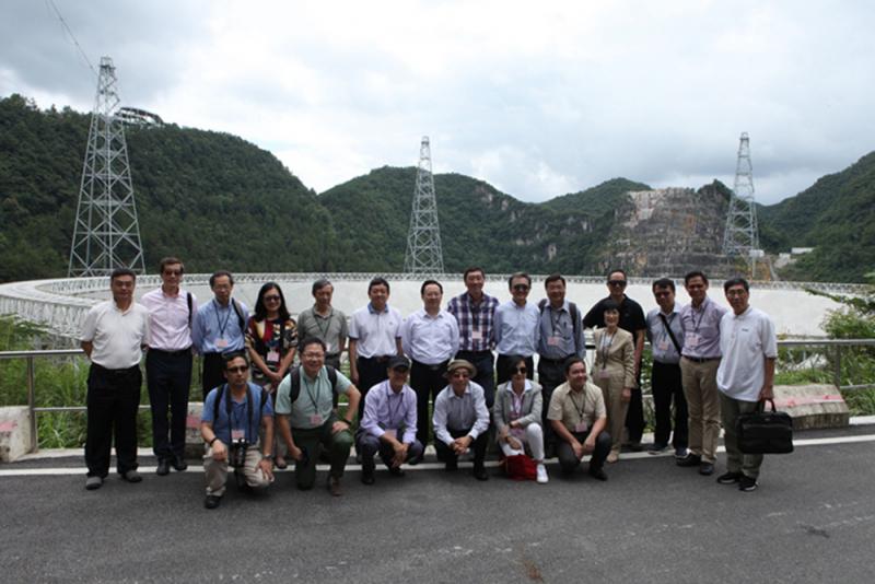 圖:香港高校校長團由中大校長沈祖堯擔任團長(後排左八)、中聯辦副主任譚鐵牛擔任總顧問(後排左七)。圖為代表團參觀五百米口徑射電望遠鏡/中聯辦網站圖片
