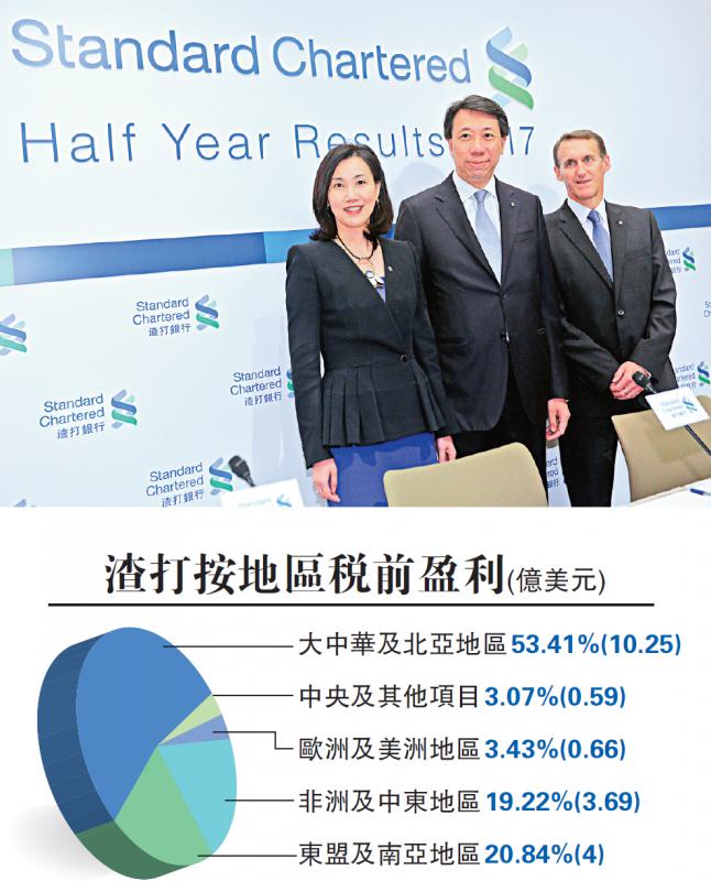 今年上半年,渣打稅前基本盈利為19.19億元,按年增加93%,或不計及去年資本融資虧損,則增加36%。三大客戶類別均按年錄得增長,其中企業及機構銀行業務因資本融資虧損不再入帳而從中受惠,零售銀行業務未有受退出業務影響,其盈利有所增加,而商業銀行業務亦重獲盈利。按地區而言,大中華及北亞地區受惠於香港的強勁增長,以及韓國和中國內地轉虧為盈,錄得歷來最大按年升幅。股東權益基本回報為5.2%,較2016年同期的2.1%顯著改善。