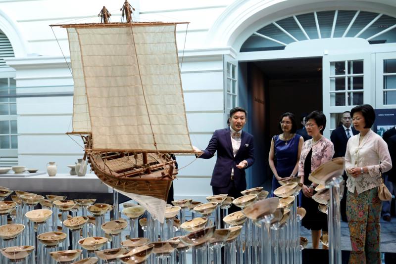 圖:行政長官林鄭月娥昨日展開上任後首次外訪行程,出訪新加坡及泰國。圖為她昨日到訪新加坡亞洲文明博物館,參觀在唐代沉船「黑石號」發現的長沙窰及青釉瓷器等展品/路透社