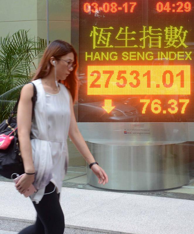 圖:亞太區股市昨日普遍下跌,港股最多跌超過二百點,收市跌七十六點