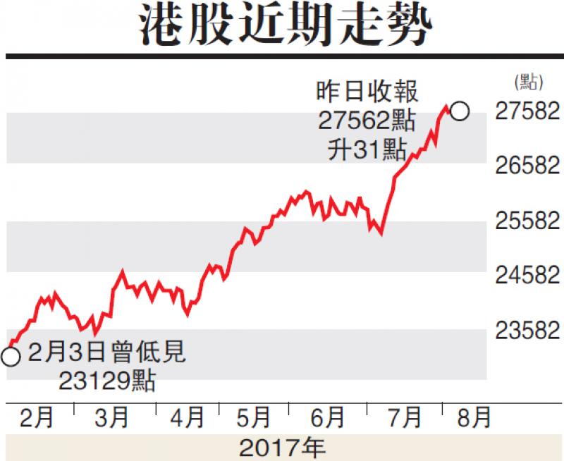 整體港股表現方面,恒指昨日窄幅上落,收市時反覆升31點,報27562點,全周累升583點。