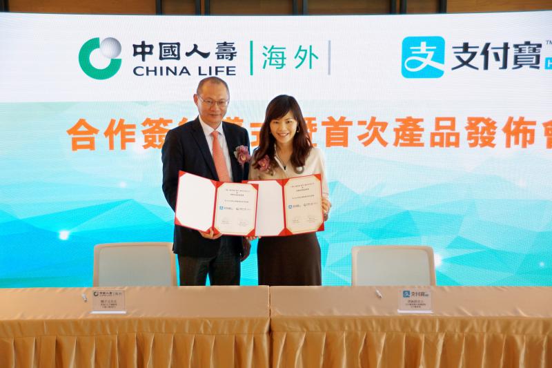 中國人壽(海外)香港分公司總經理簡子又(左)及支付寶港澳台區總經理李詠詩(右)作為代表簽署合作協議。