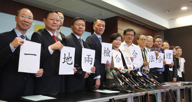 五名有法律界背景的建制派立法會議員,包括經民聯梁美芬,民建聯張國鈞、周浩鼎,獨立議員吳永嘉、何君堯,聯同約二十名法律界人士,昨日成立「法律界關注『一地兩檢』聯席」,並發表八項聲明,支持「一地兩檢」及「三步走」方案。多個民調亦顯示,支持「一地兩檢」方案的市民佔絕大多數,最高比例更高達九成七,呈壓倒性優勢。