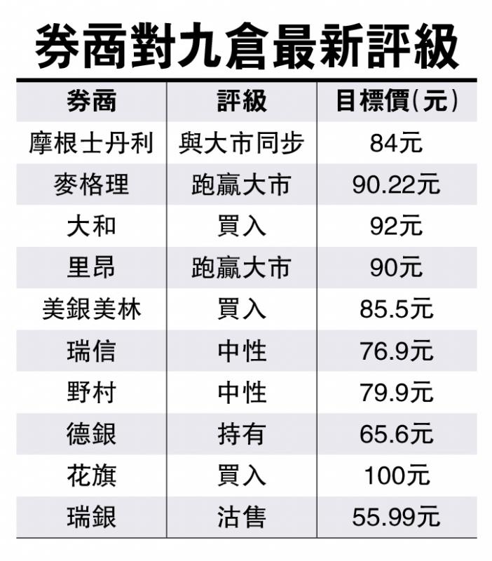 多間大行對九倉分拆業務的反應不一,大摩發表報告指,九倉分拆投資物業上市,預計其估值可升至每股87元,但認為分拆令派息增添不明朗因素,該行對九倉的評級由「增持」降至「與大市同步」,而目標價由73元升至84元。