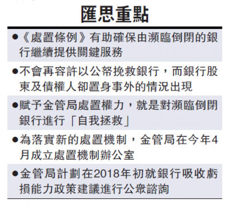 他續稱,《處置條例》的實施令該局有更齊全的手段去緩減銀行倒閉的震盪。然而,金管局必須與銀行合力做好準備和處置規劃,才能真正發揮處置安排的成效。具體而言,銀行或需重整本身的法律、財務和運作架構,以清除妨礙處置的障礙。他又提到,「自我拯救」是有序處置的重要一環,但只適用於銀行某些類別的負債,因此必須訂立規則,先確保銀行具備足夠能力去對沖虧損,有「自救」的能力。換言之,吸收虧損能力是「自我拯救」、保障納稅人的先決條件。當然,對銀行股東和債權人也要公道,因此《處置條例》保證股東和債權人實施「自我拯救」,他們最終的待遇不遜於啟動清盤程序。而金管局計劃在2018年初就銀行吸收虧損能力政策建議進行公眾諮詢。