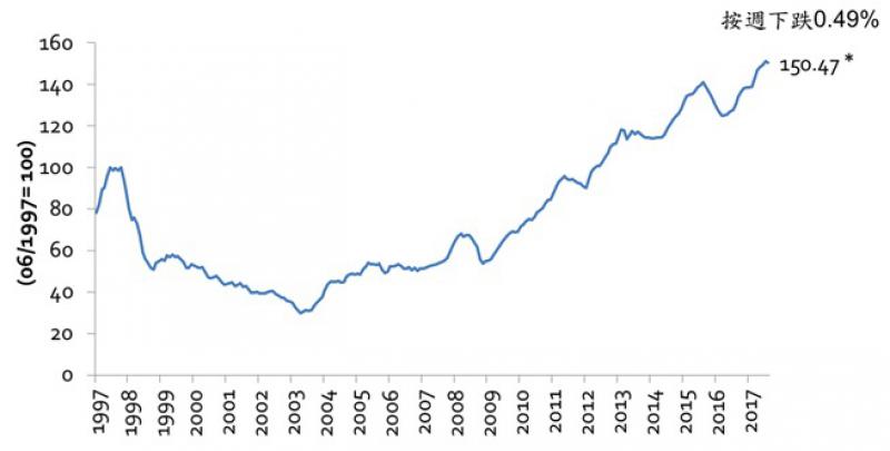 樓價方面,「美聯樓價指數」報150.47點,按周回落約0.49%,連跌兩個星期;若與四星期前相比,則跌約0.38%。然而,若以年內迄今累積計算,仍錄約8.42%的升幅。