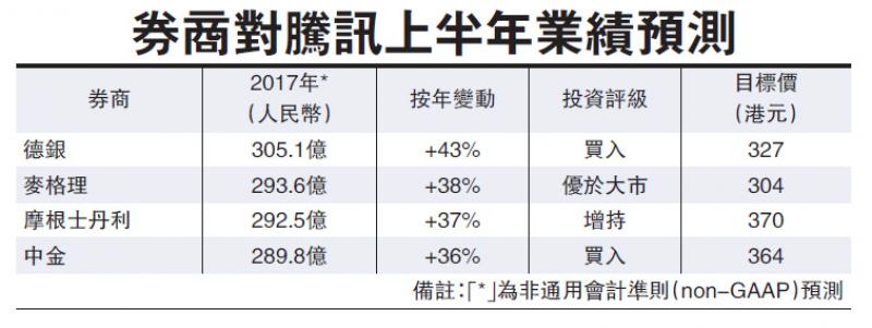 券商預測騰訊上半年利潤由284.3億至305.1億元不等。單計第二季業績,高盛預期騰訊收入高達520億元,按年增長45%,盈利增長30%至150億元。