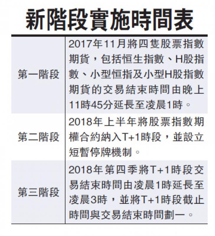 首階段會是於11月實施,4隻股票指數期貨,包括恒生指數期貨、H股指數期貨、小型恒指期貨及小型H股指數期貨的交易結束時間由晚上11時45分延長至凌晨1時。第二階段,將於2018年上半年實施,屆時會將股票指數期權合約納入T+1時段,並設立短暫停牌機制。最後第三階段,將設於2018年第四季,屆時T+1時段交易結束時間由凌晨1時延長至凌晨3時,並將T+1時段截止時間與交易結束時間劃一。現時4隻股票指數期貨恒生指數期貨交易結束時間為晚上11時45分,截止時間則為凌晨12時30分。