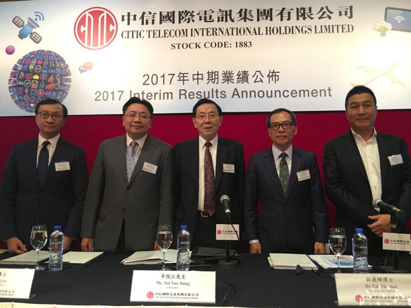 圖左起:中信電訊CPC行政總監何偉中、中信電訊財務總裁陳天衛、主席辛悅江、行政總裁林振輝、澳門電訊行政總裁潘福禧/大公報記者李潔儀攝