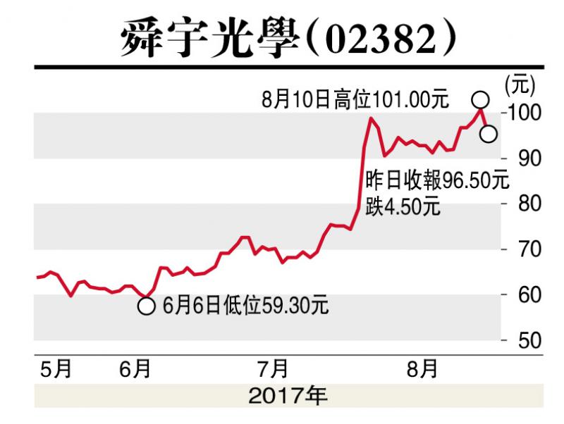 此外,作為光學龍頭股舜宇光學上周曾晉身紅底股,周五隨大市下跌,集團將於下周一(14日)公布業績,此前已發盈喜預期中期大幅增加。