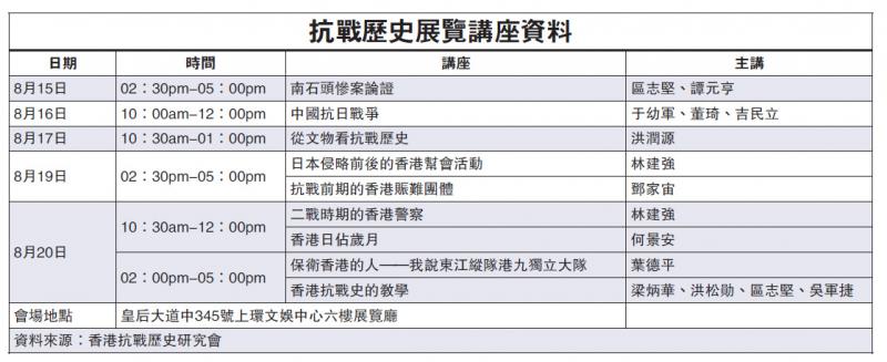 展覽將於皇后大道中345號上環文娛中心六樓展覽廳舉行。屆時還會展出許多與抗戰有關的珍貴文物和文獻資料,並有其他香港知名學者舉行講座,講述香港幫會、賑難團體和警察抗戰期間的事跡(詳見附表)。