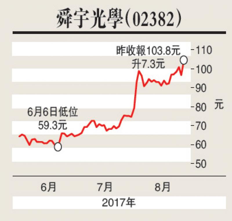 恒指服務公司將於周三公布恒指季度檢討,其中舜宇光學(02382)為「染藍」大熱門之一,其股價更升穿100元成為紅底股,上升動力充足,短線順勢追好倉,值博仍高。早前集團發出盈喜,預期中期純利大幅增加逾120%,主要受惠銷售收入大幅增加及利潤率上升所致。此外,集團7月份手機鏡頭出貨量按年增59%至5224萬件,車載鏡頭出貨量按年增54%至274萬件,仍保持高增長趨勢。