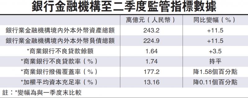 同期,商業銀行貸款損失準備餘額為2.9萬億元,較上季末增加747億元;撥備覆蓋率為177.2%,較上季末下降1.58個百分點;貸款撥備率為3.09%,較上季末下降0.02個百分點。同期,商業銀行(不含外國銀行分行)加權平均核心一級資本充足率為10.64%;加權平均一級資本充足率為11.12%;加權平均資本充足率13.16%,分別較上季末降0.15、0.16及0.11個百分點。