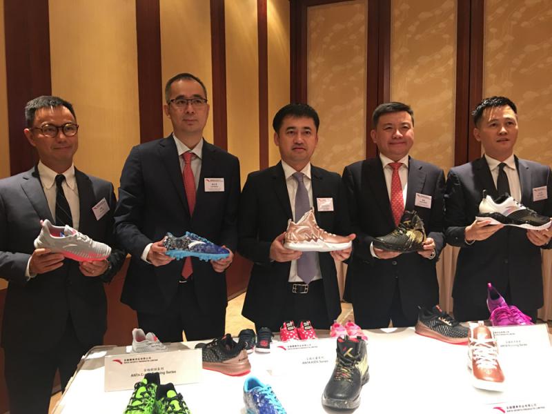 圖:(左起)安踏體育首席財務官林戰、首席運營官賴世賢、主席兼首席執行官丁世忠、安踏品牌總裁鄭捷、集團銷售總裁吳永華 大公報記者李潔儀攝
