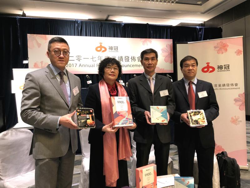 (左起)神冠控股財務總監吳旭陽、主席兼總裁周亞仙、副總裁茹希全、副總裁溫錦培(大公報記者吳涵宇攝