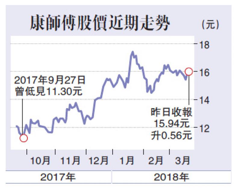 單計第四季,股東應佔虧損收窄至1.19億元,每股虧損2.13仙。摩根士丹利報告指出,康師傅去年第四季虧損收窄情況,優於該行預期,相信主要受銷售成本減省所致。該行給予康師傅「減持」評級,目標價13.6元。康師傅昨天股價先跌後升,早段跌至15.04港元的逾一個月低位,午市派發成績表後收復失地,收市炒高3.6%。