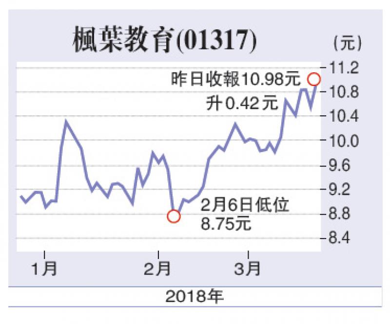 楓葉教育(01317)於中國營運國際學校有逾二十二年經驗,為領先的國際學校辦學團體,通過結合中西方教育理念,提供K-12優質雙語教育。早前公布截至2017年8月31日止全年度業績,營業額10.83億元(人民幣,下同),按年升30.54%;純利4.1億元,按年升33.46%,毛利亦有按年34.38%的升幅。