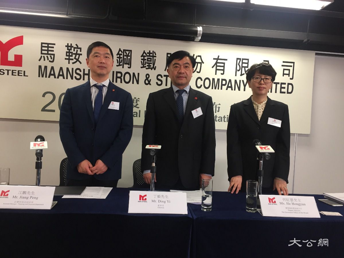 圖說:(左起)馬鋼計劃財務部副經理江鵬,董事長丁毅,董事會秘書室副主任何紅雲 (大公報記者陳詠賢攝)