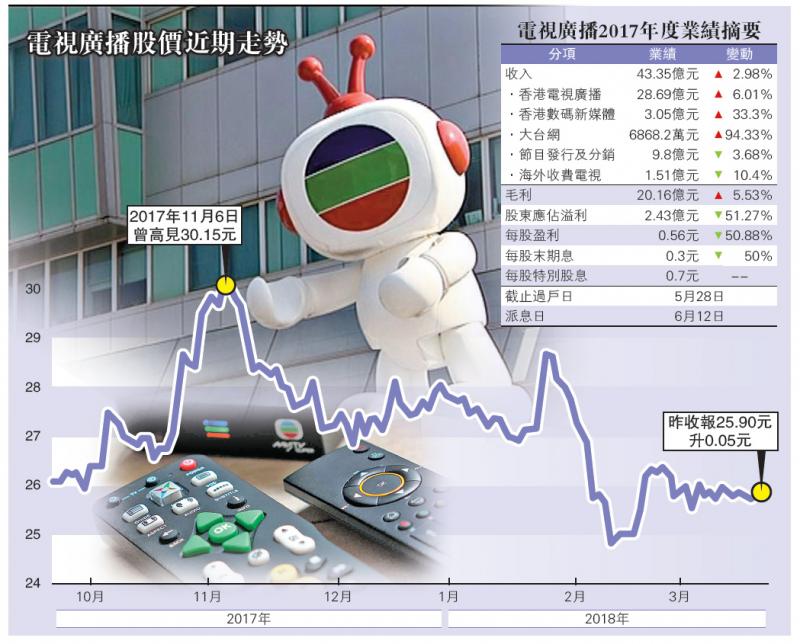 香港廣告市場表現呆滯,及全球數碼革命對許多傳統業務模式帶來的重大衝擊,電視廣播(00511)截至去年底止年度純利大幅倒退51.27%至2.43億元,每股盈利0.56元,派末期息每股0.3元和特別息每股0.7元。電視廣播主席陳國強在業績報告中表示,去年是公司過去十年所經歷最嚴峻的年度之一,但由於廣告市場隨香港整體經濟向好持續復甦及增長,相信最艱難時刻已經過去。/ 大公報記者 林靜文