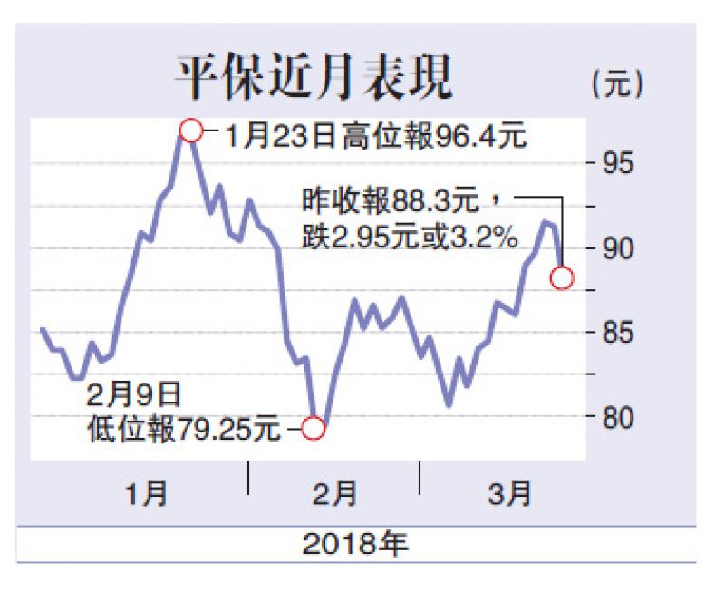 【大公報訊】記者邵淑芬報道:中國平安(02318)去年業績強勁,增派股息,一眾大行亦紛紛唱好。不過,由於受大市倒跌影響,平保股價亦先升後跌。平保股價受業績理想刺激,昨曾一度高見94.8元,升3.89%,但臨近收市倒跌,跌穿90元關口,收報88.3元,跌3.23%。