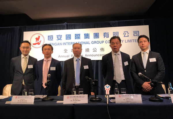 (左起)恆安國際執行董事兼副財務總監李偉樑、執行董事及運營中心總裁兼商貿銷售總監許水深、主席施文博、行政總裁及副主席許連捷、執行董事及運營中心副總裁兼運營管理部總監許清池(大公報記者吳涵宇攝