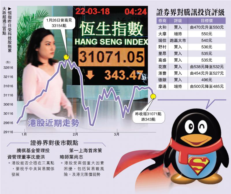 受內地A股插水所累,加上騰訊股價回軟,恒指昨日先升後倒跌343點,收報31071點,單一隻騰訊便推低指數162點。國企指數跌94點,報12427點。投資者擔心騰訊股價周五復市後再插,恒指夜期昨日曾跌509點。本地科技股普遍跟隨下跌,金山軟件(03888)去年網上遊戲業務同樣遜預期,股價跌10.1%,報26.6元;易鑫集團(02858)股價在公布業績後持續向下,昨日再跌7.6%,報4.96元。