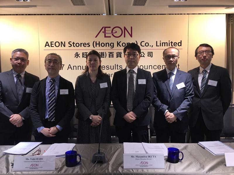 (左起)永旺百貨營運董事劉志森、行政董事谷島英明、主席兼董事總經理羽生有希、副董事總經理生田政光、企業合規董事翟錦源、企業財務部總經理楊子成。(大公報記者李潔儀攝)
