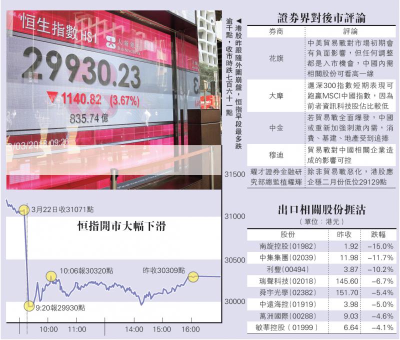 中美貿易戰爆發,美股狂瀉,亞太股市哀鴻遍野,港股跟隨外圍崩盤,恒指最多跌1140點,收市時跌761點,以30309點收盤,30000點大關失而復得;同時受騰訊(00700)大股東沽貨影響,主板成交額錄得2834億元,較上日增加84%,是2015年4月大時代以來最活躍。花旗、中金教投資者應戰招數,建議吸納中資內需股;中金認為,若貿易戰惡化,中國或重新採用刺激內需策略。受美股早段高開帶動,恒指夜期反彈,曾經升119點,見30266點。/大公報記者 劉鑛豪