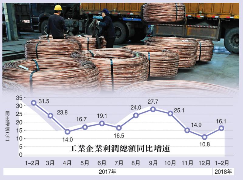 今年前兩個月,全國規模以上工業企業實現利潤總額9689億元(人民幣,下同),同比增16.1%,增速較去年12月加快5.3個百分點,延續快速增長勢頭。國家統計局工業司何平博士認為,隨着供給側結構性改革的深入推進,工業經濟運行正呈現積極變化,工業收入保持良好增勢,企業效益迎來向好開局。/大公報記者 倪巍晨