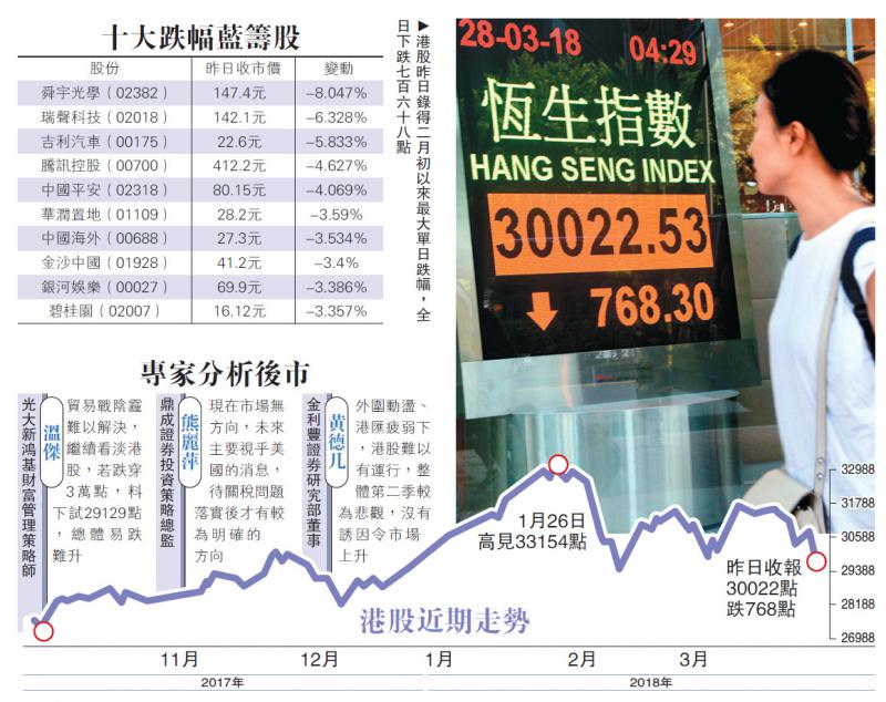 隔晚美股再度急跌,加上港股長假期臨近及適逢期指結算日,恒指昨日低開260點後反覆向下,最終跌768點或2.5%,收報30022點,險守三萬點關口。科網股成重災區,舜宇(02382)和瑞聲(02018)分別急挫逾8%和6%,騰訊(00700)亦跌4.6%。中資金融股捱沽,中國平安(02318)連跌七日後,再跌4%,守住80元大關。分析員普遍看淡後市,料大市待美國關稅問題落實後才有明確方向,短期與中美貿易戰絕緣的股份較具抗跌力。/大公報記者 林靜文