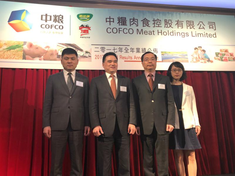 圖:(左起)中糧肉食首席財務官李雷、董事會主席兼執行董事江國金、執行董事兼總經理徐稼農、戰略部總經理兼聯席公司秘書張楠 大公報記者吳涵宇攝