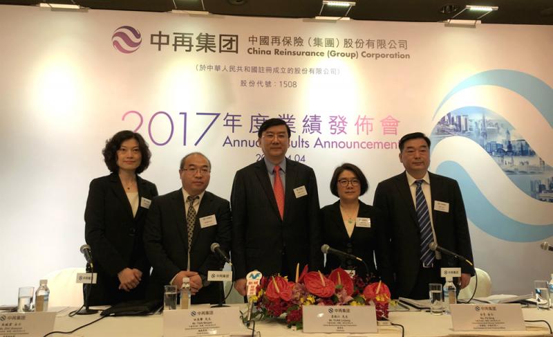 圖:(左起)中國再保險董事會秘書朱曉雲、總精算師田美攀、董事長袁臨江、副總裁兼財務負責人余青、業務總監李明\大公報記者吳涵宇攝