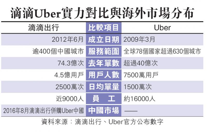 滴滴出行回應大公報查詢時表示,目前該公司主要業務位於內地,香港則剛剛開展的士業務,其他海外市場仍未有業務,惟去年該公司於中國總單數高達74.3億次,日均單量為2500萬次,遠高於Uber的總單數40億次及日均單量1500萬次,滴滴出行去年運送乘客更超過100億人次,約是中國民航的二十倍,亦為中國鐵路系統的三倍。