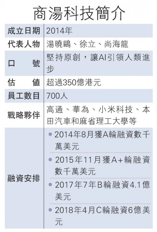 商湯科技由香港中文大學工程學院團隊於2014年創立,同年八月及翌年11月,分別獲得A輪及A+輪融資,涉及數千萬美元。去年七月,再獲得B輪融資4.1億美元(約32億港元),計及今次C輪融資,市場估計商湯科技的估值超過45億美元(約351億港元),成為全球估值最高的AI公司。