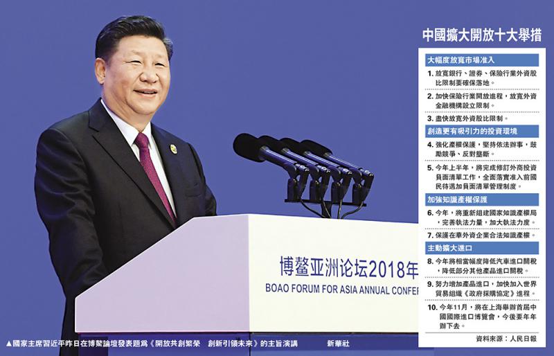 習近平宣布,中國決定在擴大開放方面採取一系列新的重大舉措。
