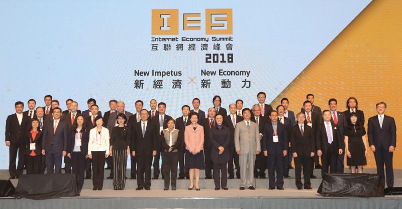 圖:特首林鄭月娥(前排左八)出席互聯網經濟峰會,與眾專家講者合照