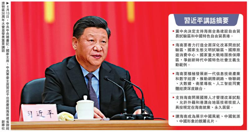 圖:4月13日,中共中央總書記、國家主席、中央軍委主席習近平出席慶祝海南建省辦經濟特區30周年大會並發表重要講話/新華社